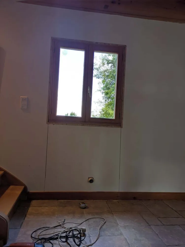 Le cœur du chantier a consisté à créer de nouveaux points d’entrée de lumière. La création de 3 ouvertures a radicalement changé l’atmosphère du chalet, apportant clarté et profondeur à l’espace de vie principal. L’intégration d’une porte d’entrée plus fonctionnelle et mieux isolée complète cette modernisation.